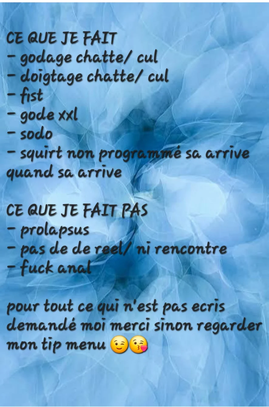 Ce que je fais : anal, vanginal,squirt,fist vaginalet anal ,double (penetration anal et vaginalou chatte) triple penetration chatte) double domi chatte ,domi chatte et cul,pommeau vitesse chatte et cul bate de baseball chatte ...sodomie en live baise ejac facial j'avale aussi mr me fist je prend partout